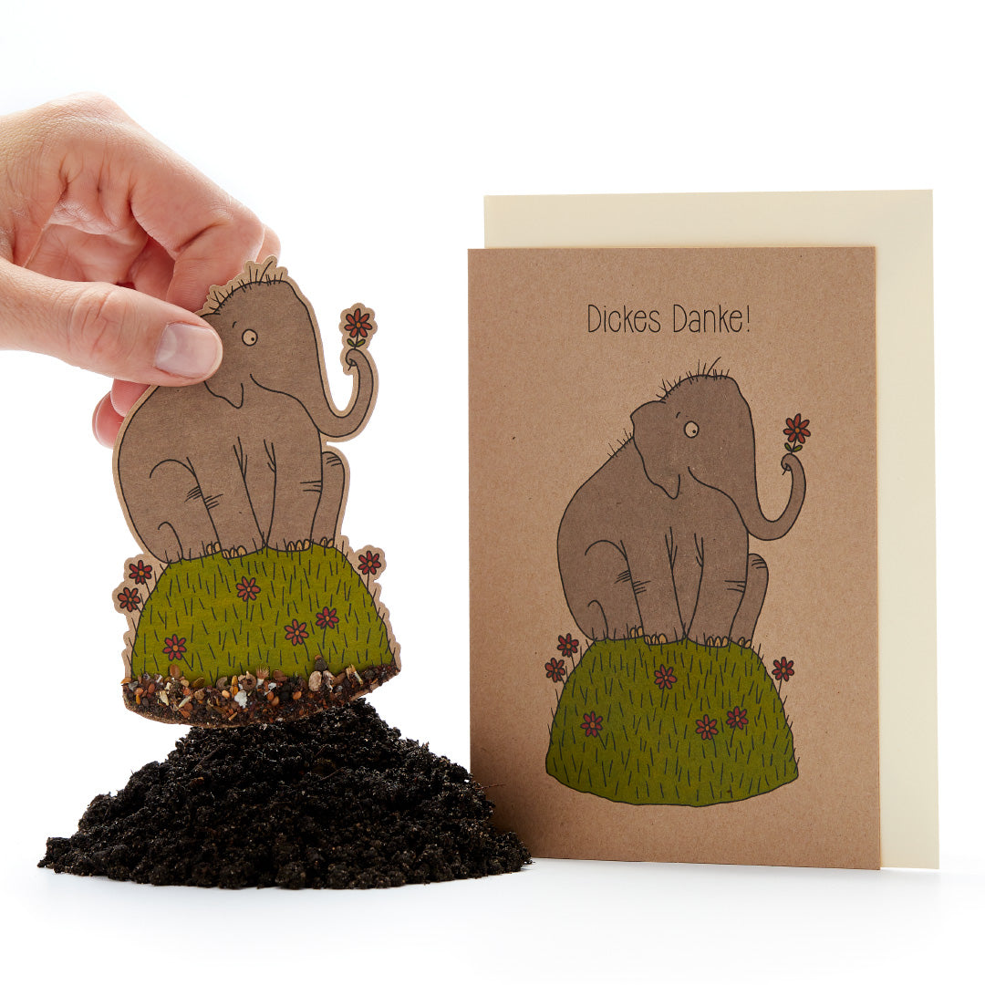 Du willst einfach mal DANKE sagen? Egal, ob als Anerkennung für einen Gefallen, als Antwort auf ein Geschenk oder einfach als kleine Aufmerksamkeit zwischendurch. Diese besondere Grußkarte punktet nicht nur durch den sympathischen Elefanten auf der Front (ist er nicht süß?), sondern auch durch die Blumen, die am Hang des Hügels sprießen. Eine nette Geste, die noch lange in kunterbunter Erinnerung bleibt.