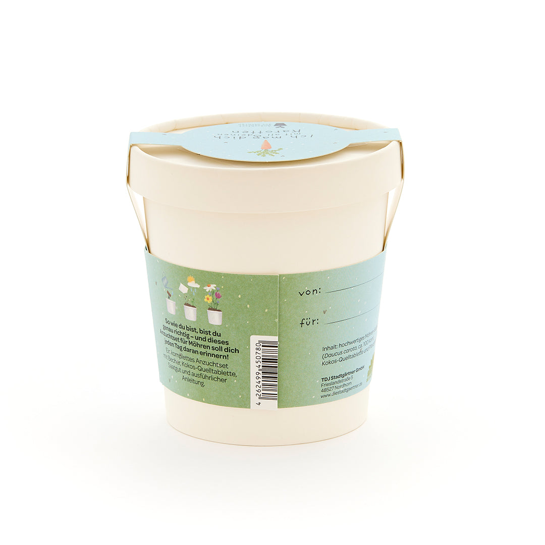 Ich mag dich – mit all deinen Karotten: Dieses liebevoll gestaltete Anzuchtset für Karotten ist eine originelle Botschaft an all jene, die man genauso mag, wie sie sind – mit Ecken, Kanten und kleinen Karotten. Der witzige Spruch kombiniert Zuneigung mit Humor und macht den Becher zum perfekten Geschenk für Lieblingsmenschen.
