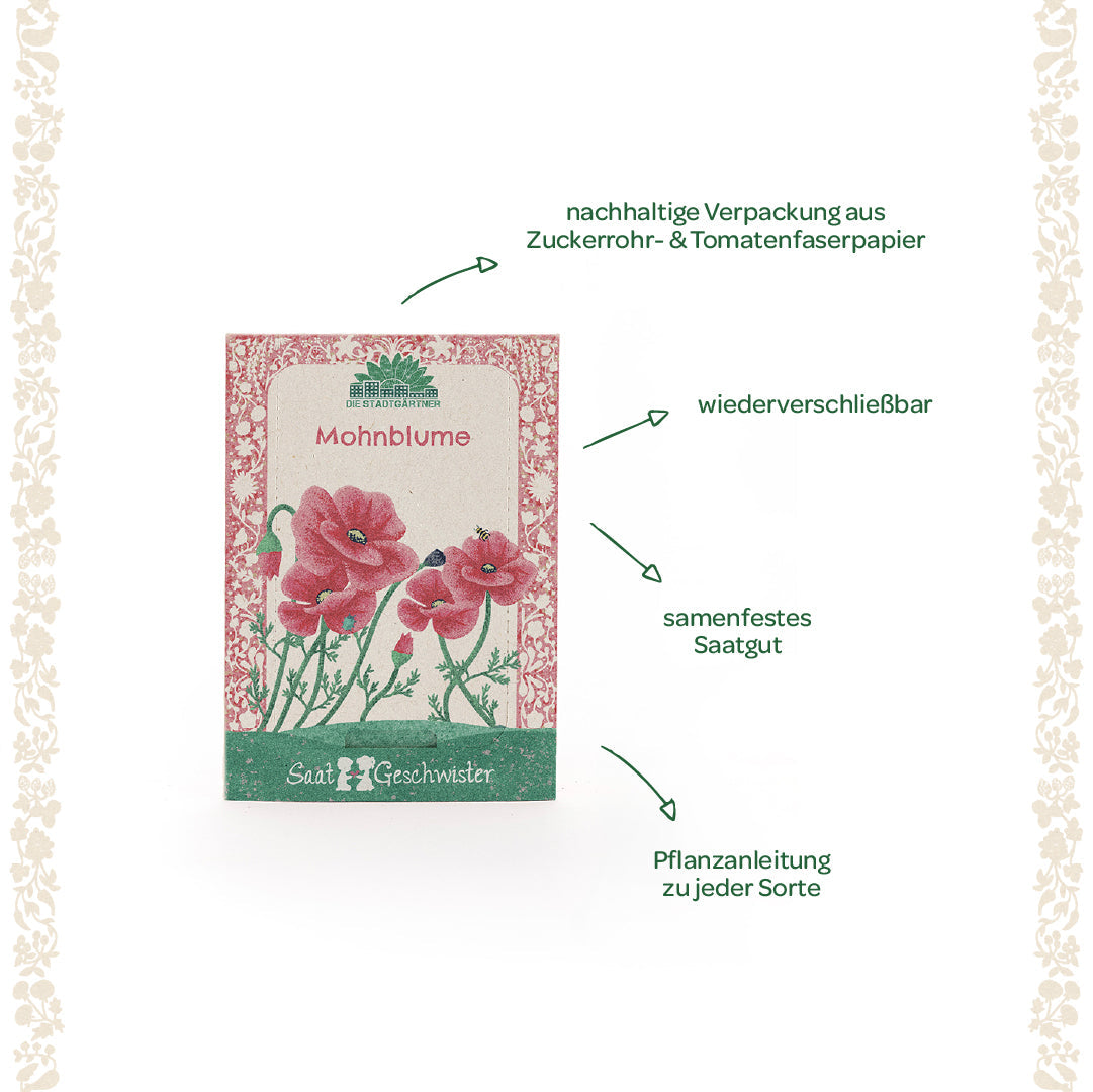 Tolle Geschenkidee: Ob als kleine Aufmerksamkeit, Geburtstagsgeschenk oder Mitbringsel – das Saatgut Mohnblume ist eine wundervolle Möglichkeit, Sommerfreude und Blütenpracht zu verschenken.