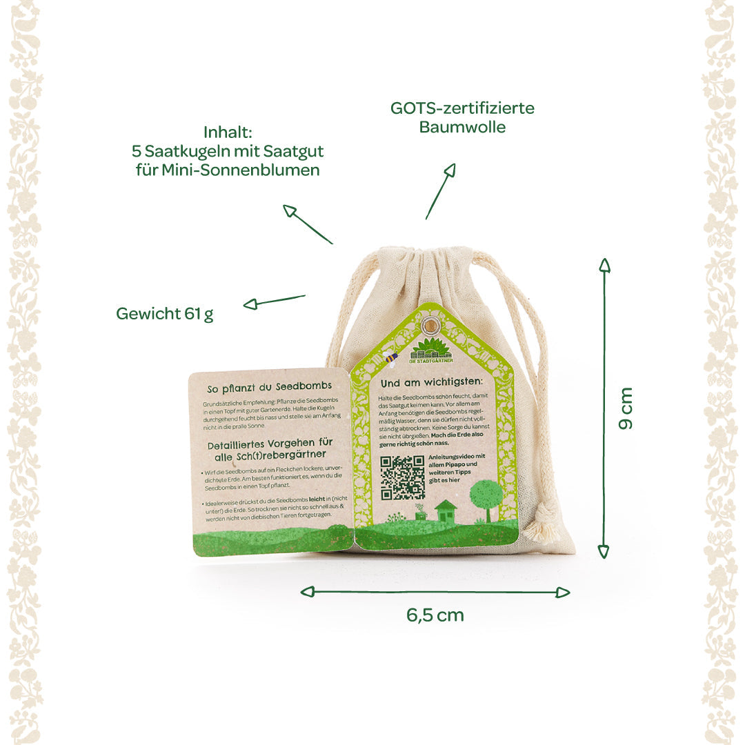 Ein sonniges Geschenk: Die Saatkugeln im hübschen Baumwollsäckchen sind ein tolles Geschenk für Gartenfreunde, Naturliebhaber und Sommerfans. Ob zum Geburtstag, als Mitbringsel oder kleine Aufmerksamkeit – sie bringen Freude und Sonne ins Zuhause.