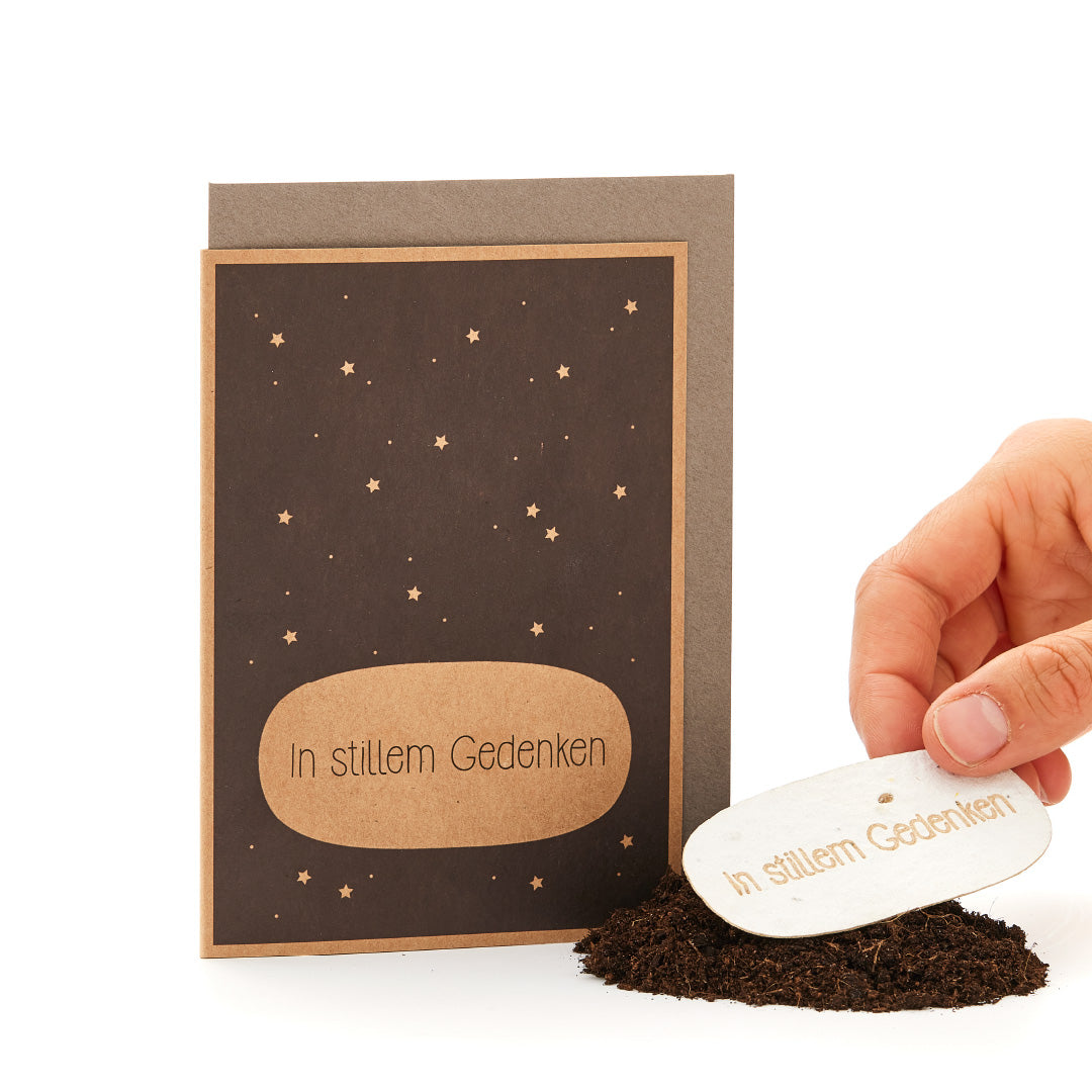 Die Karte ist schlicht und klassisch gestaltet und hat, wie alle unsere Karten, einen integrierten Blumenstrauß. Die angeheftete Wolke besteht aus handgeschöpftenm Saatpapier. In einem Blumentopf löst die Wolke sich in Blumen auf und spendet so Trost und Hoffnung.