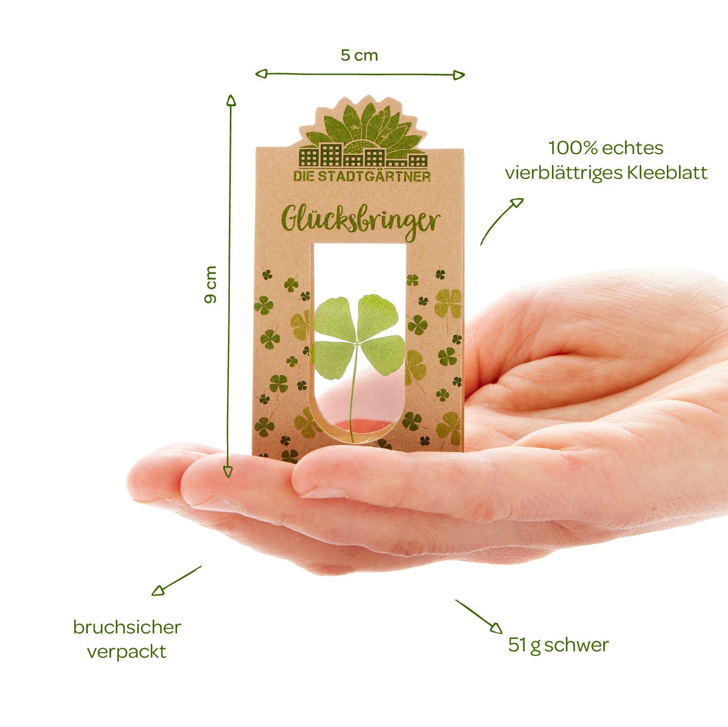 Erinnerst du dich noch an dieses wohlige Kribbeln, als du in der Kindheit stundenlang die Wiesen durchforstet und dann voller Stolz ein vierblättriges Kleeblatt gepflückt hast? Dieses Glücksgefühl haben wir dir mit unserem Glücksbringer als liebevolle Geschenkidee konserviert. Denn wir finden: Glück zu verschenken, ist eines der schönsten Geschenke, die du anderen machen kannst. Egal ob vor einer Prüfung, zum Geburtstag, als kleine Aufmerksamkeit an Silvester oder einfach als Überraschung für einen geliebten Menschen. Mit dem Glücksbringer zeigst du: Du bist mir wichtig, ich wünsche dir alles Glück der Welt!